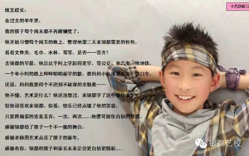 银都艺校第44期结业汇报后,小艺员初三班叶家豪家长致王校长的信。