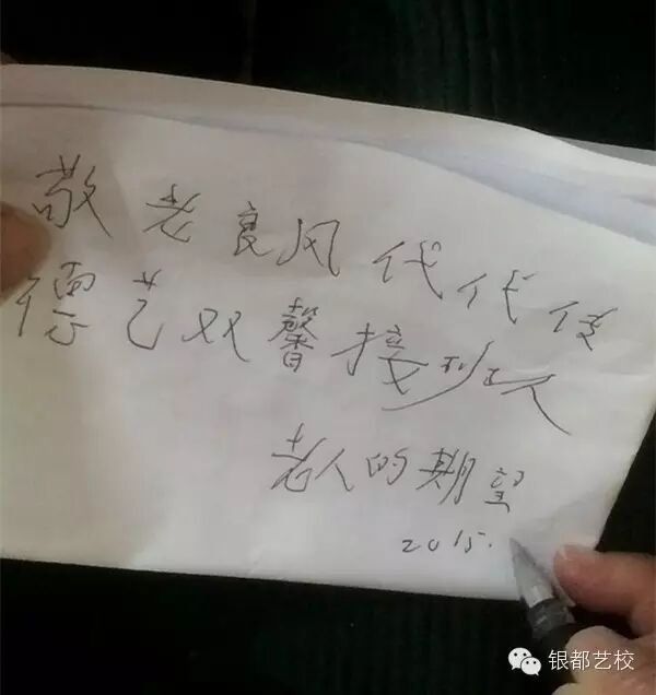 有一位97岁高龄的奶奶为银都艺校的孩子们写下一句寄语。