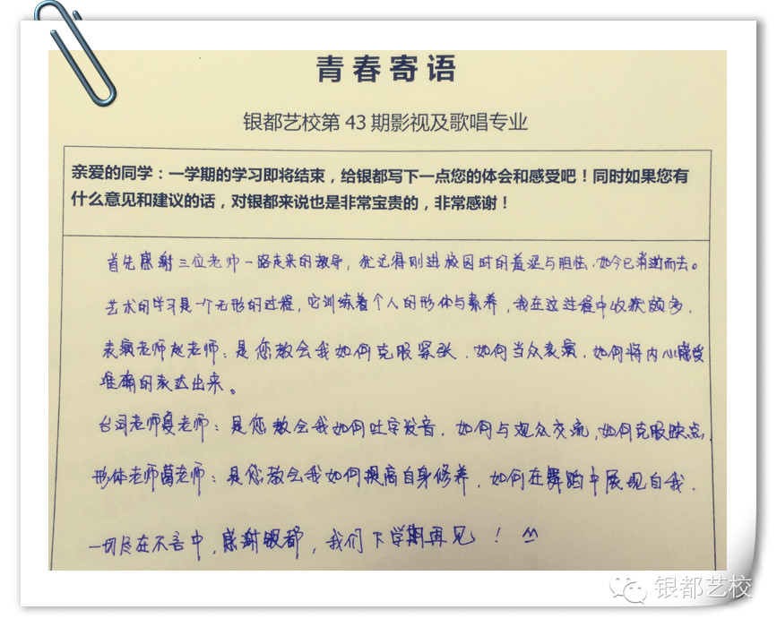 台词老师夏老师:是您教会我如何吐字发音,如何与观众交流,如何克服缺点。